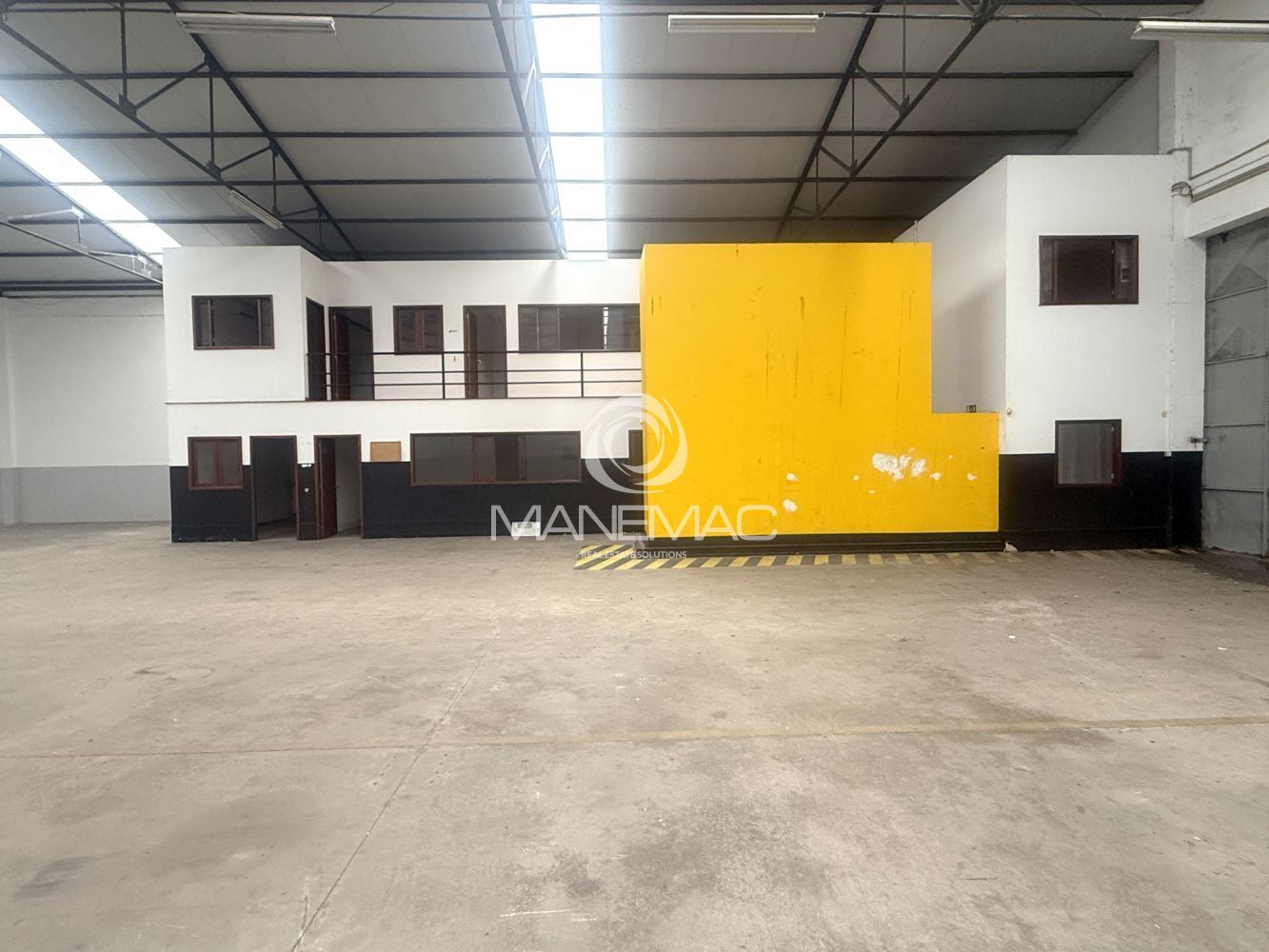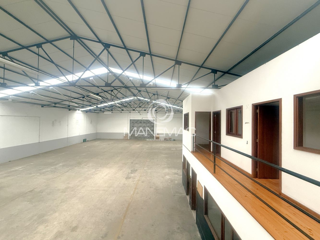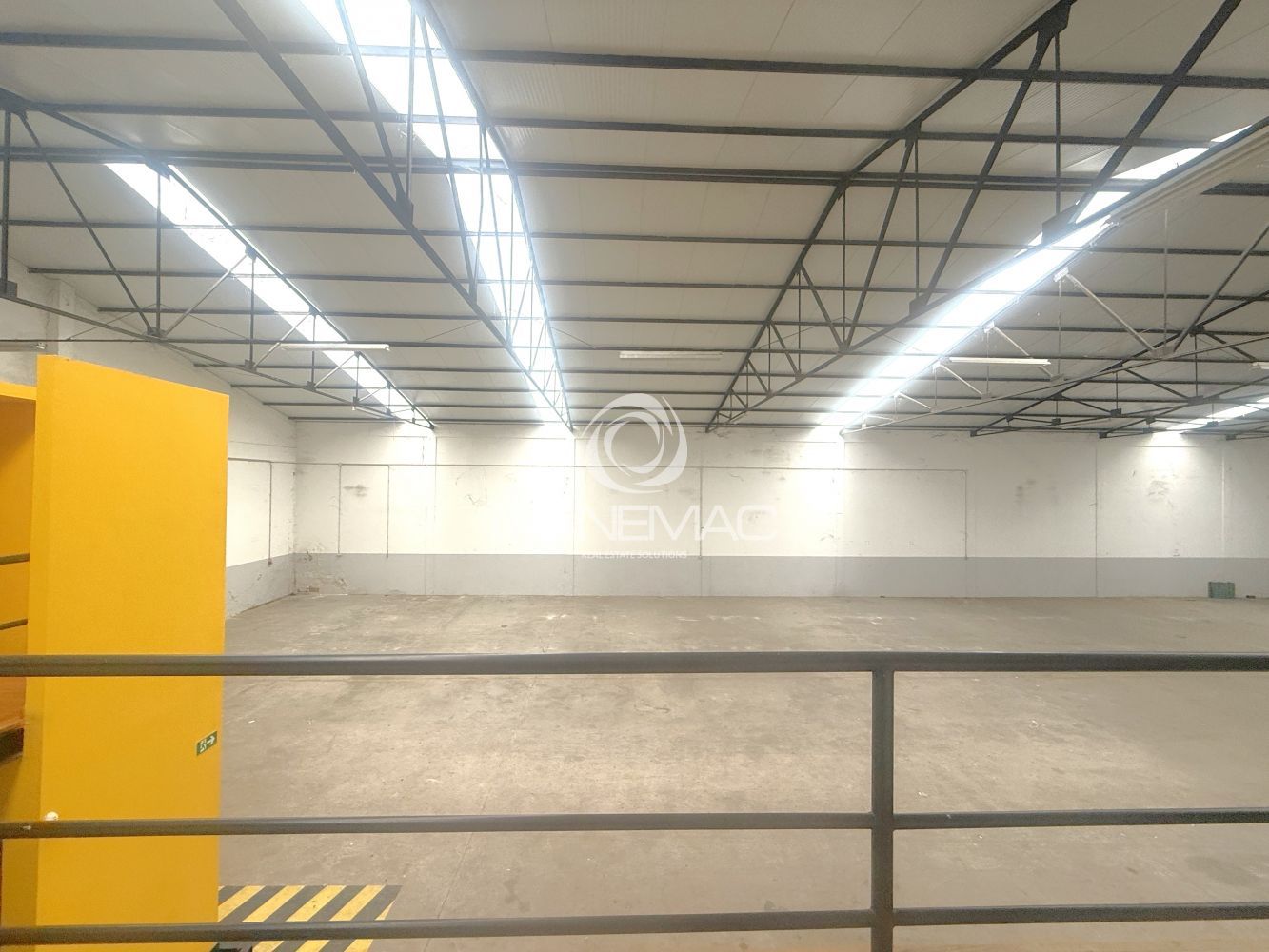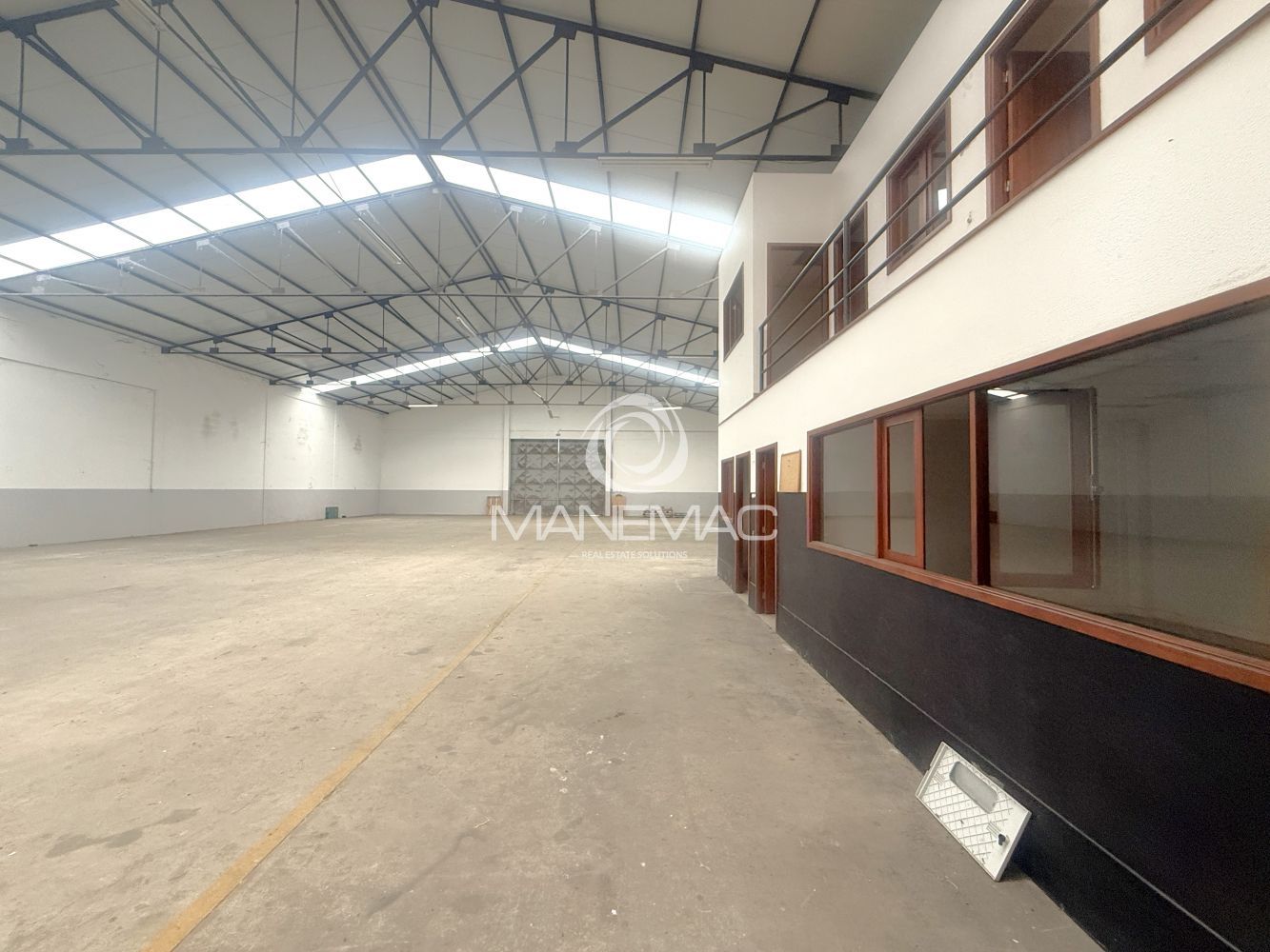 O armazém dispõe de um pé-direito de 6 metros, permitindo armazenamento em altura, instalação de estanterias industriais ou adaptação a diferentes tipos de operação. Conta ainda com telhado novo de Sandwich, com aberturas de luz natural, garantindo ótima iluminação natural no seu interior e maior eficiência energética.